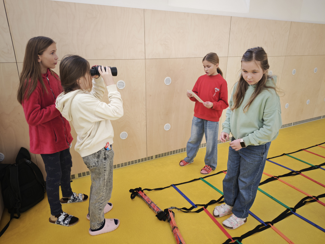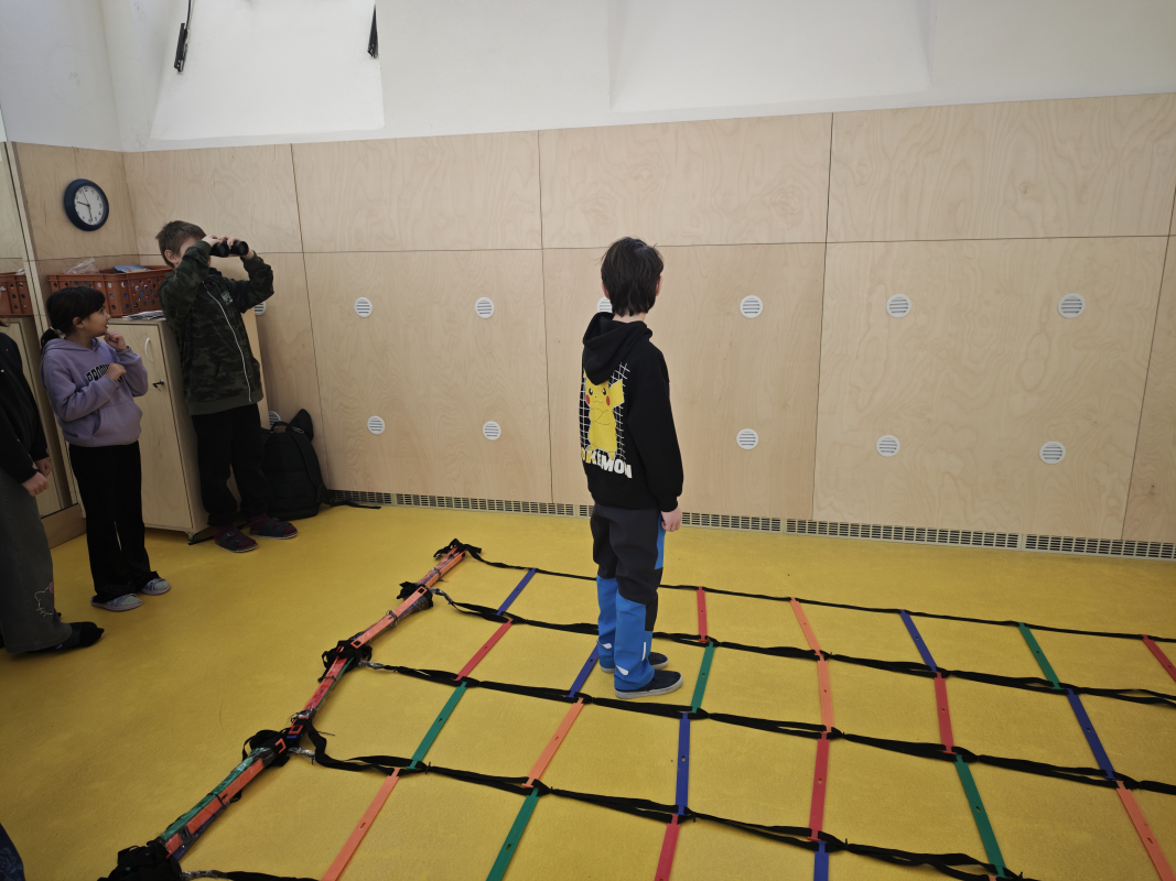Dalším oblíbeným stanovištěm byla překážková dráha „Minové pole“, která prověřila spolupráci a důvěru. Žáci pracovali ve dvojicích. Jeden měl k dispozici mapu bezpečné cesty a navigoval svého parťáka, který nesměl šlápnout na „nebezpečné“ políčko. Úspěch vyžadoval přesné instrukce, trpělivost a souhru obou členů týmu. Děti si tak mohly vyzkoušet orientaci v mapě, porozumět značení a následně vše prakticky vysvětlit tak, aby jejich spoluhráč bezpečně prošel celou dráhu.