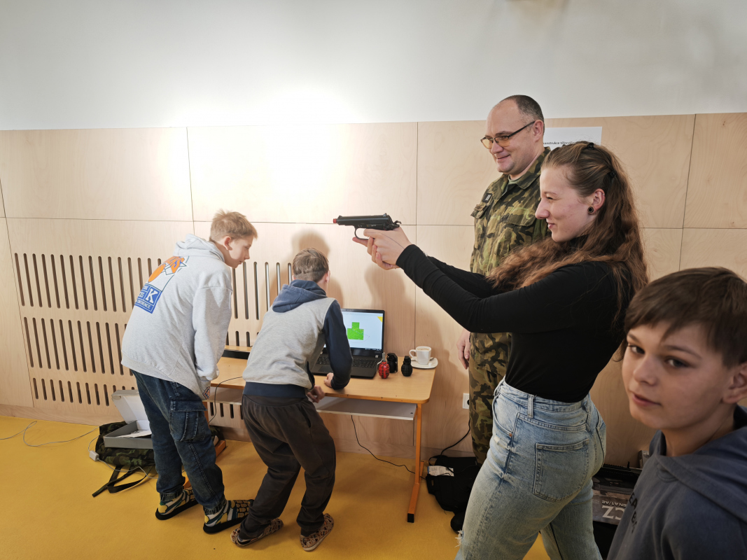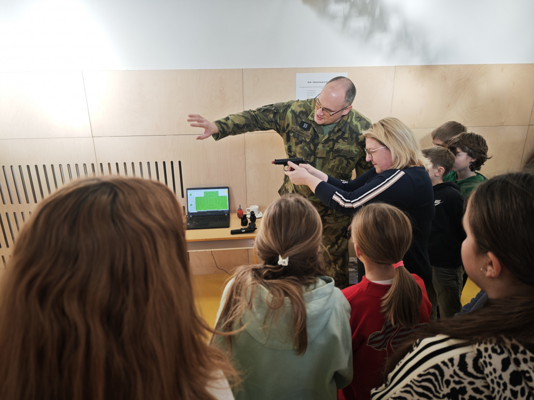 Velký zájem vzbudila i ukázka výstroje a výzbroje vojáka. Po odborném výkladu o zbraních a důkladném seznámení s bezpečnostními pravidly si děti mohly vyzkoušet mířenou střelbu na terč pomocí laserové technologie. Naučily se pracovat s mířidly, zažily pocit soustředění při zaměřování a hrdě sledovaly výsledky svých zásahů. Mnohé to natolik nadchlo, že se s kamarády okamžitě předháněli, kdo trefí střed terče nejpřesněji.